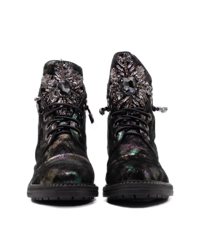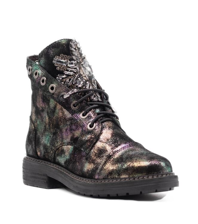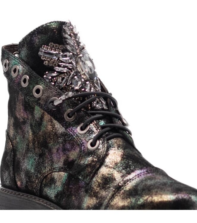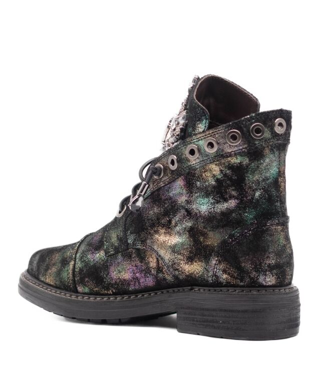 Alma en Pena I251001 dames veterboots groen combi. De binnenzool van deze halfhoge veterboots is uitneembaar. De half-hoge veterschoen is gemaakt van leer en de binnenvoering is van stof in combinatie met synthetisch materiaal.