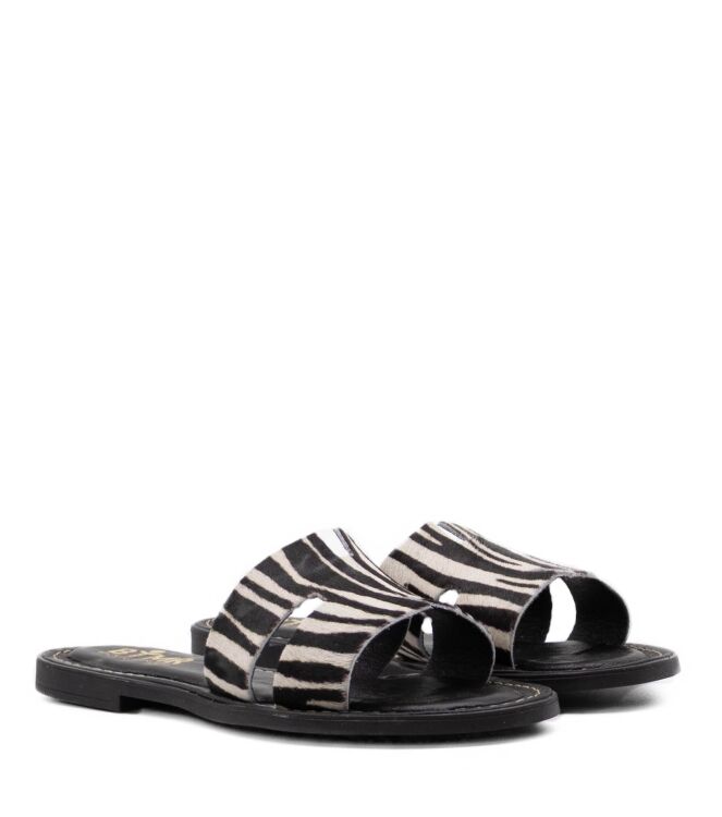 BTMR SF-77270 dames slippers zeebra zwart wit. De slipper is gemaakt van leer en de binnenvoering is ook van leer in combinatie met synthetisch materiaal.
