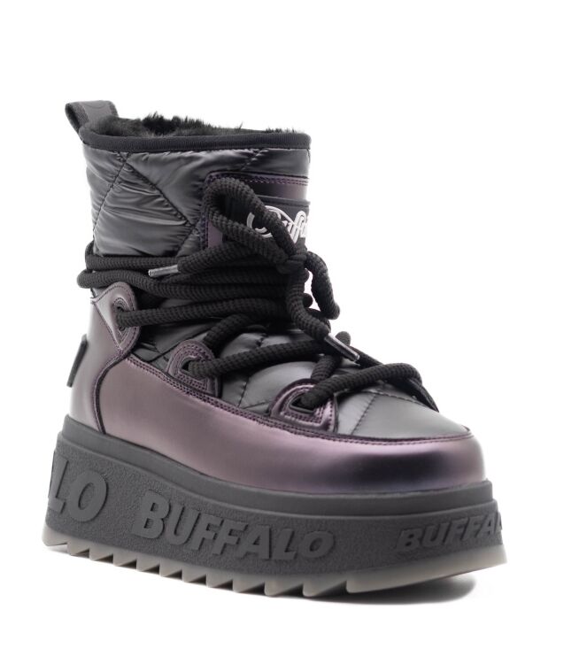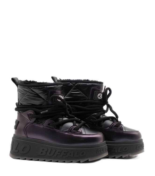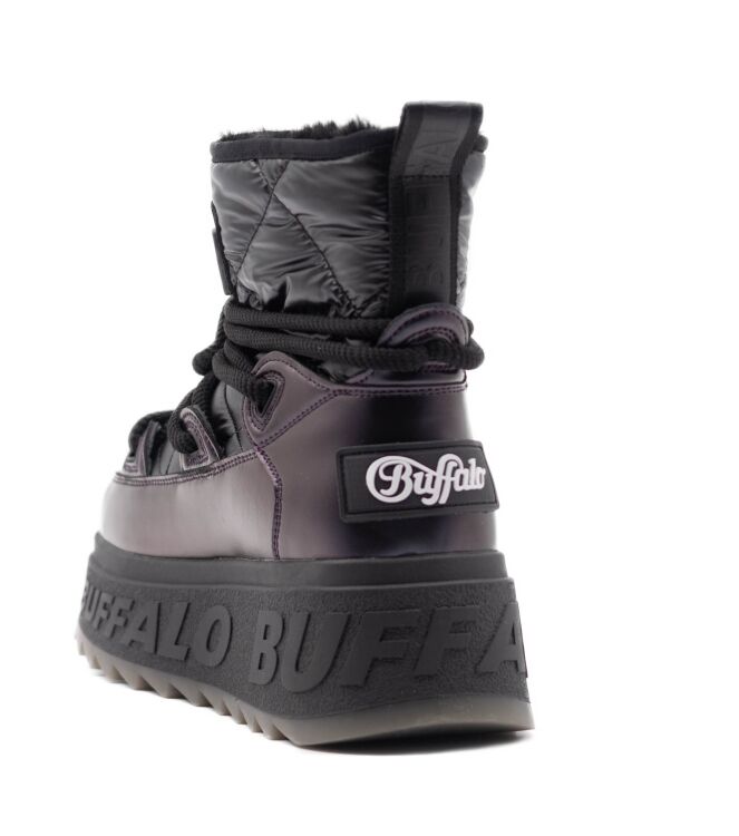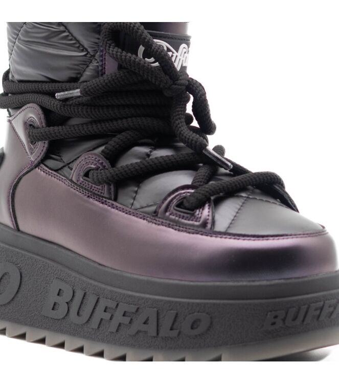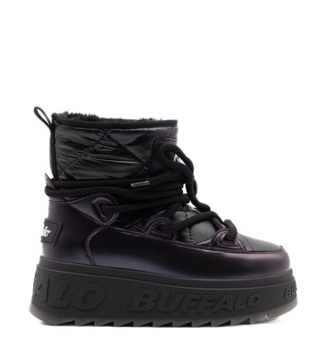 Buffalo Eliza Snow Boot 1270143 dames snowboots gevoerd zwart. De binnenzool van deze enkellaarzen is uitneembaar. De schoen is gemaakt van stof in combinatie met synthetisch material en de binnenvoering is van stof.