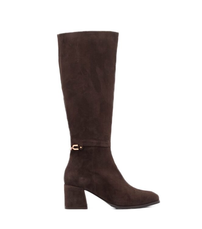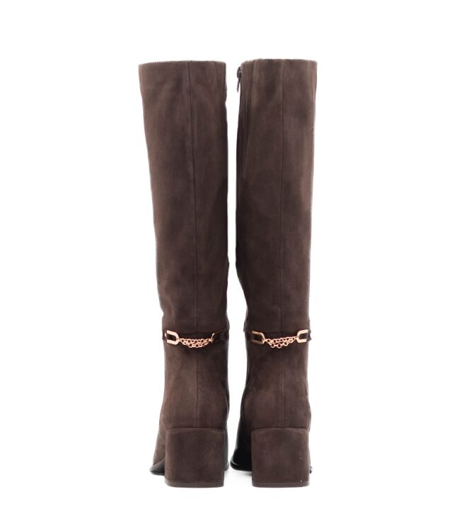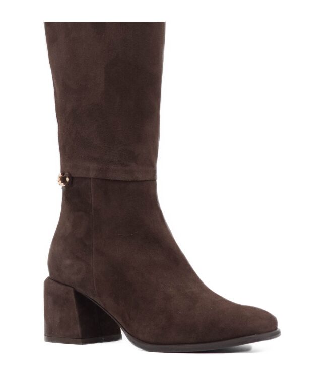 Conhpol-bis 910B-L037-2728-00X57 dames laarzen donker bruin suede. De binnenzool van deze laarzen met hak is niet uitneembaar. De schoen is gemaakt van leer en de binnenvoering is ook van leer in combinatie met stof.
