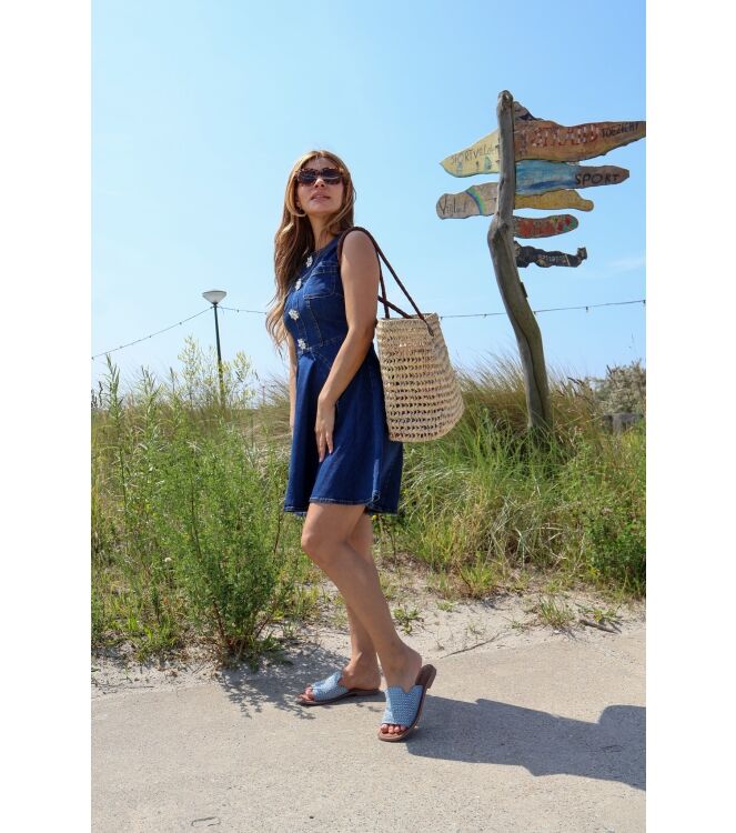 Lazamani LA75004 dames slippers denim blauw. De slipper is gemaakt van stof en de binnenvoering is van leer.