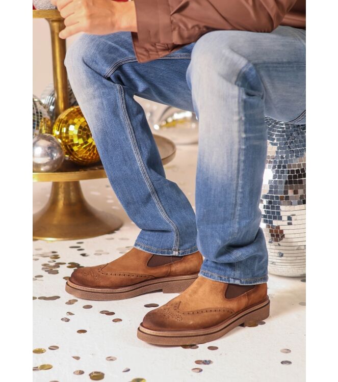 Melik 41130-02 Samtama heren chelseaboots bruin suede. De binnenzool van deze enkellaarsjes is uitneembaar. De schoen is gemaakt van suede leer en de binnenvoering is van leer.