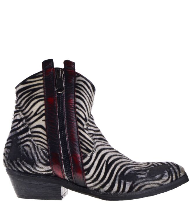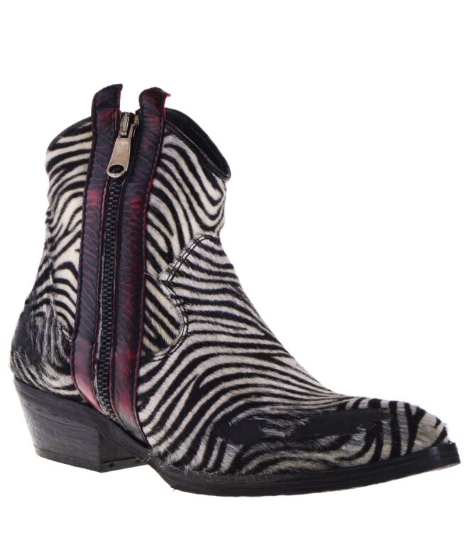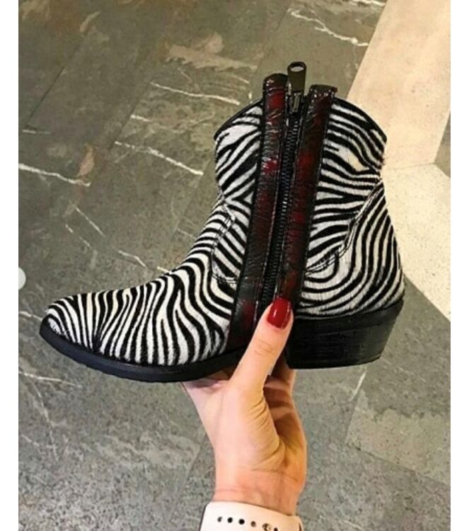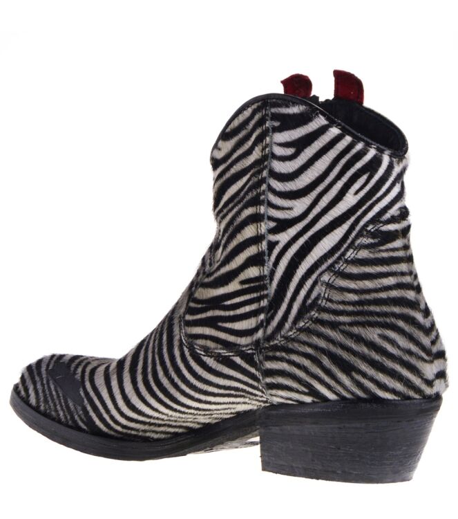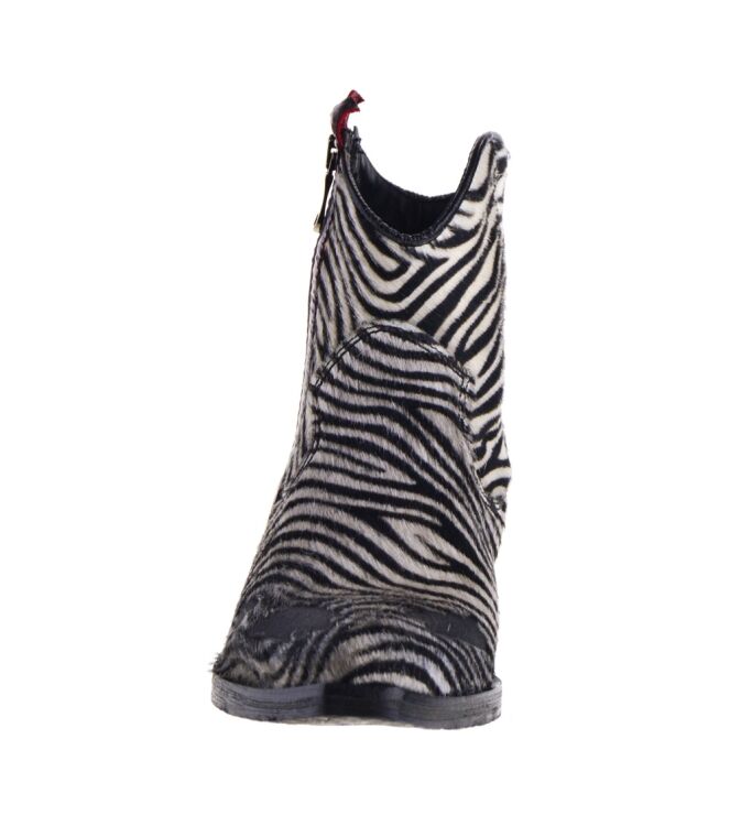 Metisse Tex70 dames enkellaarsjes zeebra. De binnenzool van deze western enkellaars is niet uitneembaar. De schoen is gemaakt van leer en de binnenvoering is van leer in combinatie met stof. De print is van ponyhaar.
