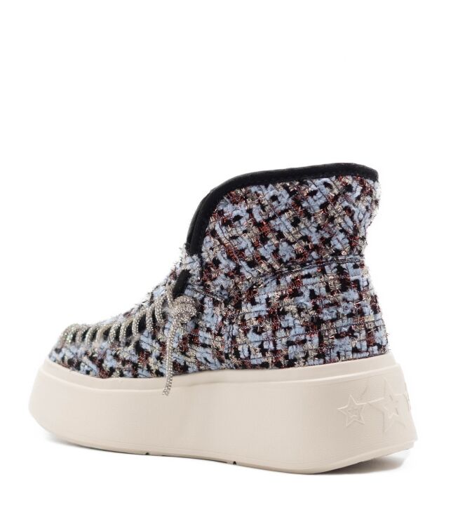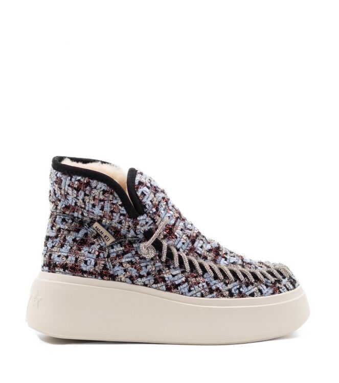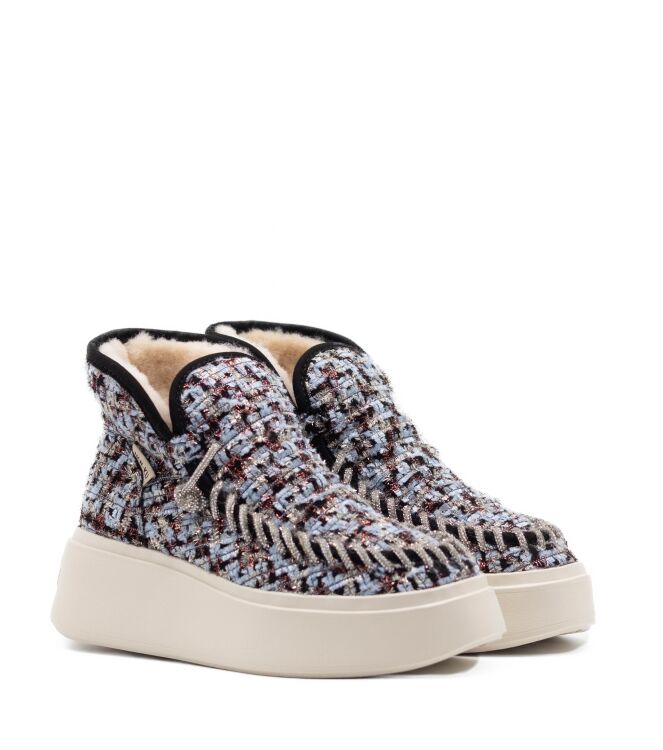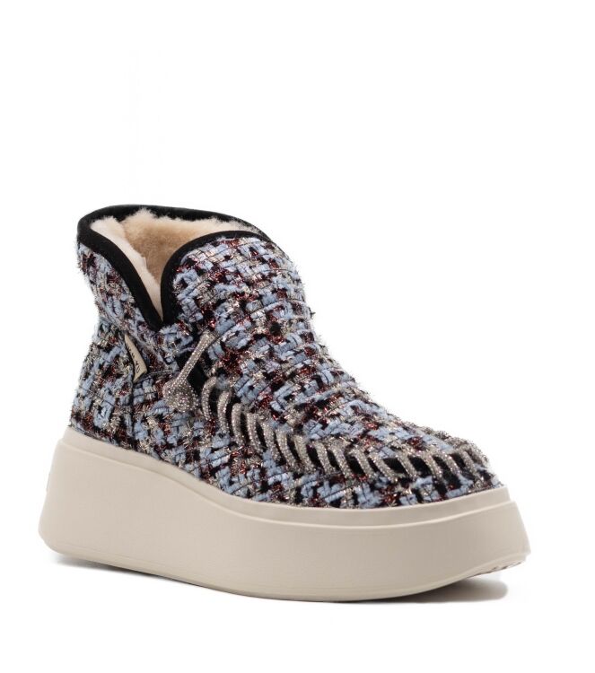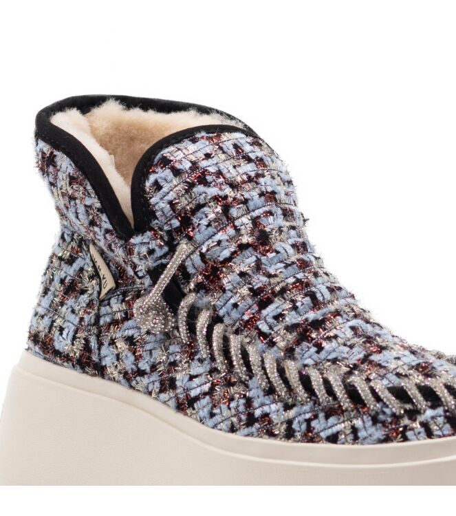 NAN-KU Couture DFH-41 dames enkelboots gevoerd blauw. De binnenzool van deze enkellaarzen is niet uitneembaar. De schoen is gemaakt van stof en de binnenvoering is van leer in combinatie met schapenwol.