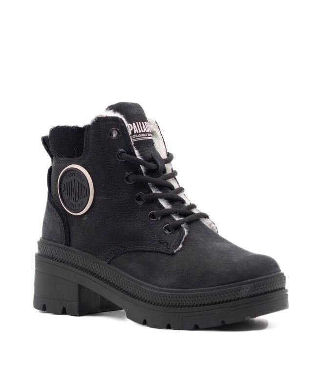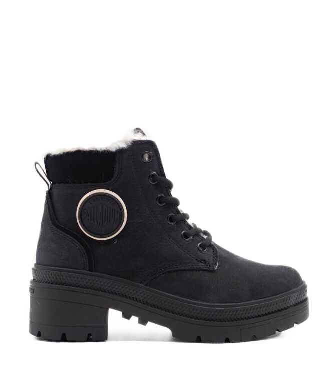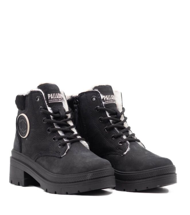 Palladium 99527-008-M Palladrise NBK dames veterboots gevoerd zwart. De binnenzool van deze halfhoge veterboots is uitneembaar. De veterschoen is gemaakt van nubuckleer en de binnenvoering is van synthetisch wol. De Pallarise NBK WL, is een combinatie van Palladiums iconische design en een verfijnde, vrouwelijke twist. De discrete rits aan de binnenzijde zorgt voor een gemakkelijke instap, terwijl de verhoogde hak elegantie en een sierlijke touch aan het silhouet toevoegt, met een warmteoverdrachtlogo op de binnenzool.