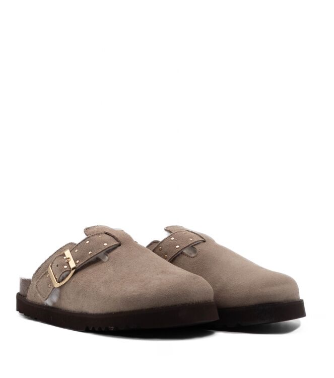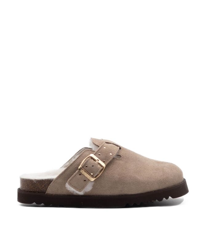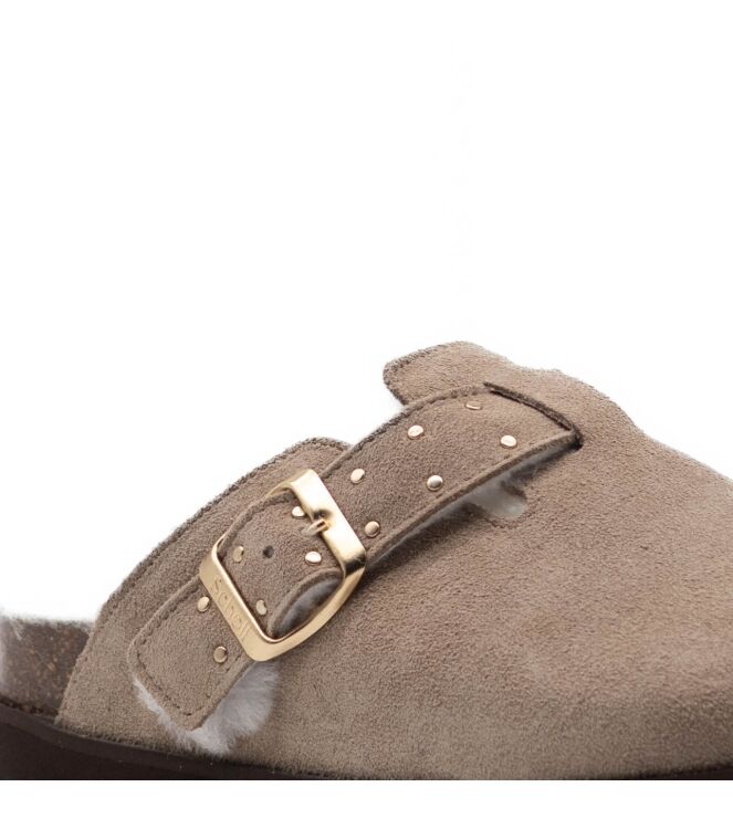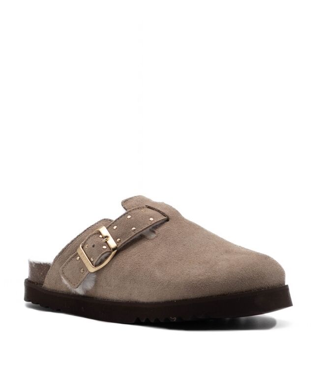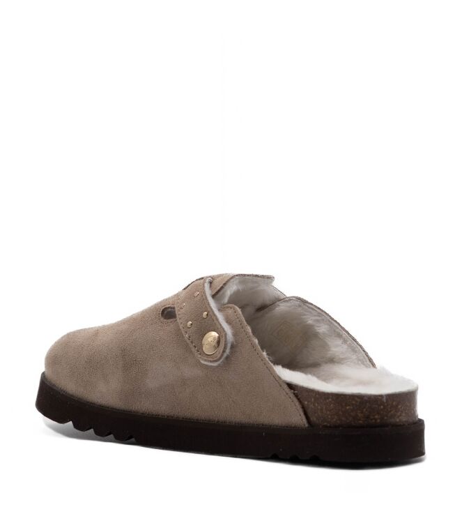 scholl Benny F32558 dames muiltjes gevoerd naturel. De binnenzool van deze muiltjes is niet uitneembaar. De schoen is gemaakt van suede leer en de binnenvoering is ook van leer in combinatie met bont.