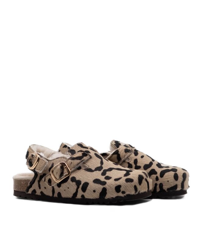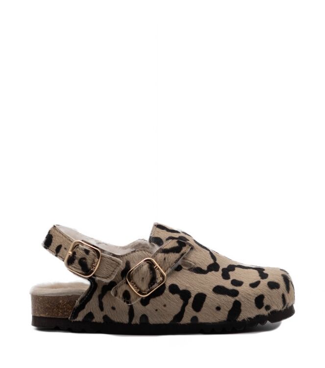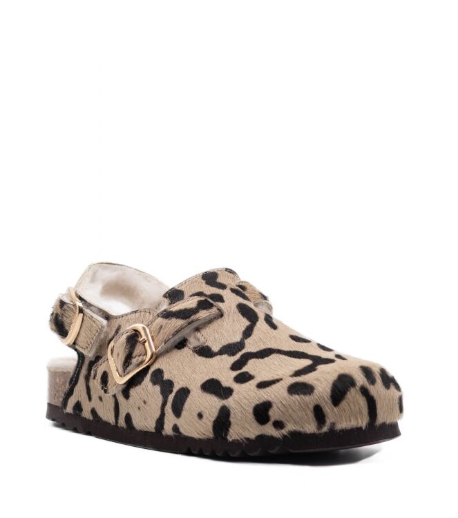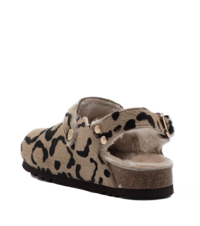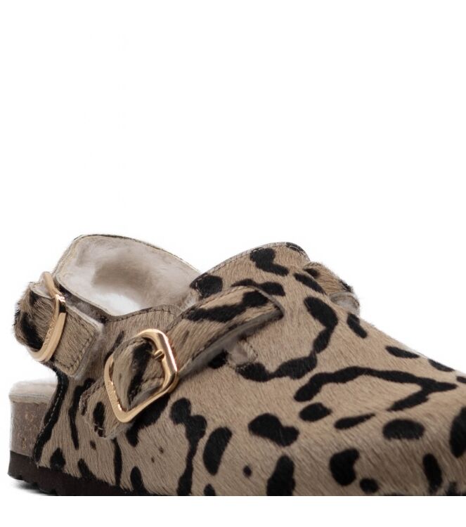 scholl F32643 Fae Backstrap dames muiltjes gevoerd jaguar. De binnenzool van deze muiltjes is niet uitneembaar. De schoen is gemaakt van leer en pony haar en de binnenvoering is ook van leer in combinatie met bont.